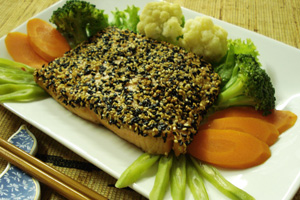 Salmão grelhado acompanhado de vegetais e gohan.